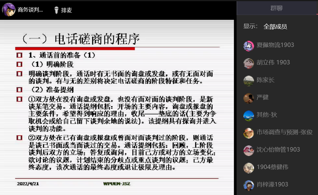 为进一步探讨如何将思政元素有机融入课程教学,达到润物无声的育人效果,2022年4月21日上午,太阳集团tcy8722市场营销系在线上进行教学观摩活动。本次教学观摩活动的课程为《商务谈判》,由我系贾书章老师主讲。