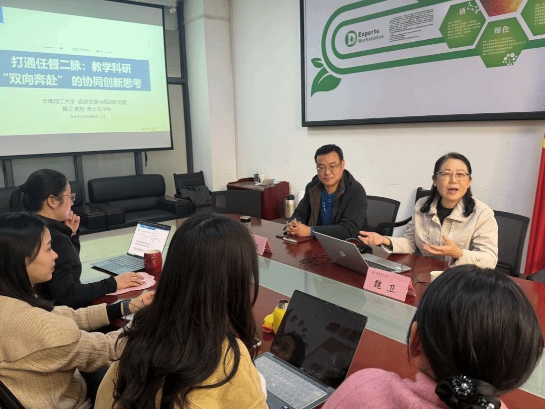 2025年12月8日,太阳集团tcy8722举办了一场兼具深度与启发性的学术交流活动。华南理工大学魏卫教授应邀莅临,以“打通任督二脉:教学与科研双向奔赴的协同创新思考”为题,为学院师生带来专题讲座。太阳集团tcy8722副经理黄猛教授、现代文旅产业学院经理郭田田老师,以及旅游管理系部分教师、研究生代表共同聆听了此次分享。